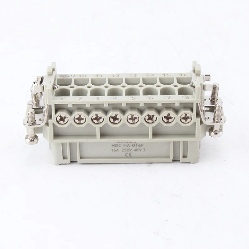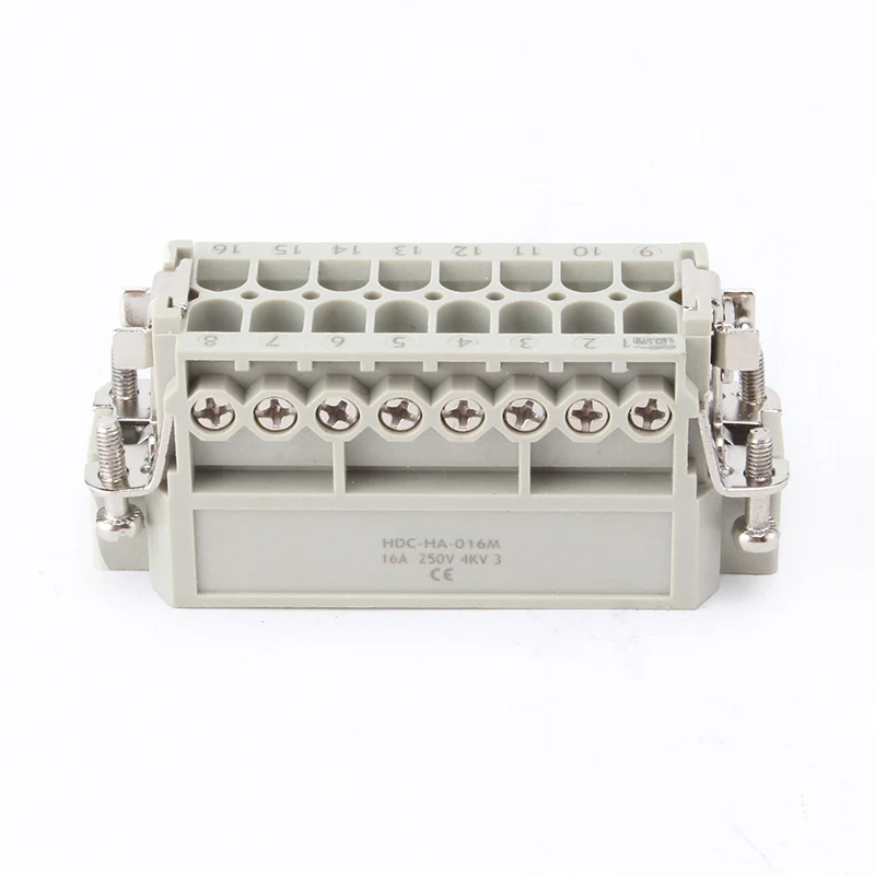 16A 10-pins zware connectoren zijn vrouwelijke en mannelijke inerte onderdelen. HA-016-M en HA-016-F zijn mannelijk en vrouwelijk, ze zijn als set op elkaar afgestemd. Ze werken samen met aluminium behuizing van H16A. De insteekcomponenten en de buitenbehuizing vormen samen een compleet connectorproduct. Ze zijn gemaakt van PC-schaal en messing pinnen met verzilverd. Verzilverde pinnen zorgen voor goede elektrische aansluitingen.